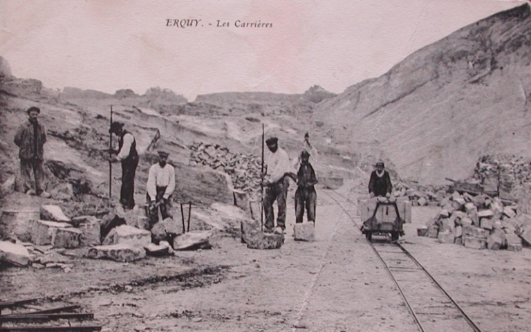 La taille des pierres et la voie ferrée Decauville utilisée avec des wagonnets pour le transportImmatriculation