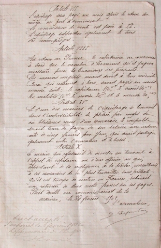 Suite du document sur les conditions d'engagement à Terre-Neuve pour les marins du trois-mâts Mathilde, signé et daté par l'armateur Léon Carfantan, le 3 février 1902Immatriculation