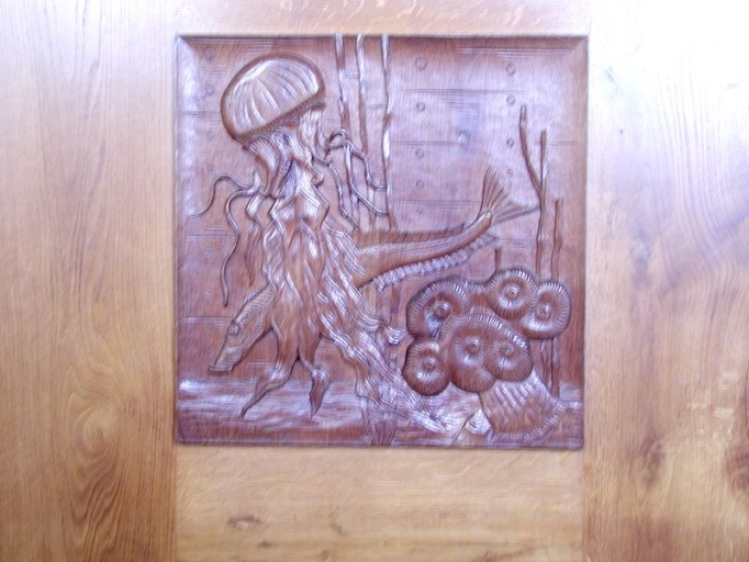 Sculpture sur bois en relief de Tullou en 1950, sur panneau à l'intérieur de la salle de réception du phareImmatriculation