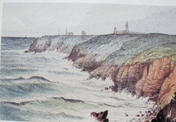 Dessin aquarellé : vue du site de Fréhel avec le phare en 1887 par le conducteur Cadin (AD 22)Immatriculation