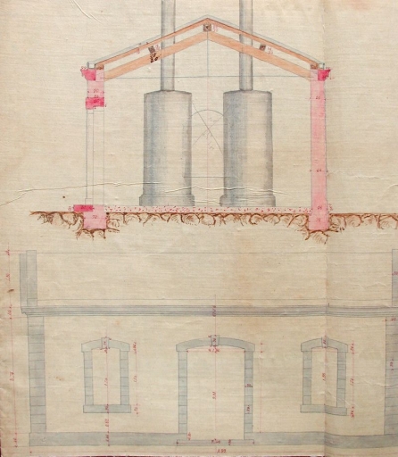Dessin aquarellé : projet de bâtiment pour trompette à vapeur et logement, selon les instructions de l'ingénieur Allard, 1884 (AD 22)Immatriculation