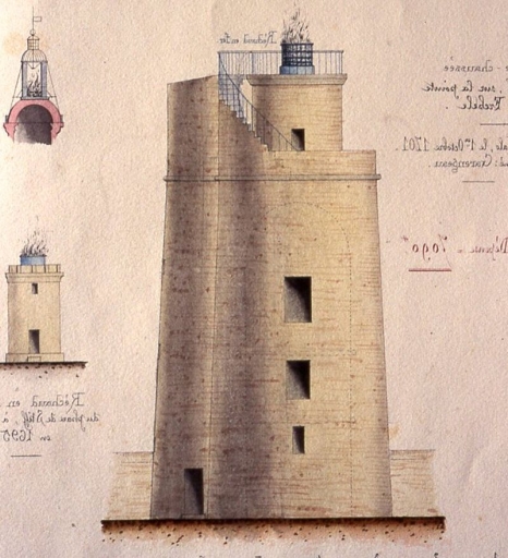 Dessin aquarellé du conducteur Cadin, 1887 : l'ancien phare de Fréhel : le projet de Garangeau en 1702, la lanterne en fer posée en 1727 (AD 22)Immatriculation
