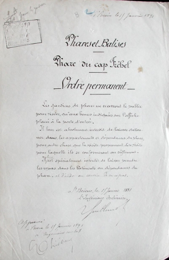 Instructions officielles pour les gardiens du phare, 1891 : l'ouverture au public (AD 22)Immatriculation