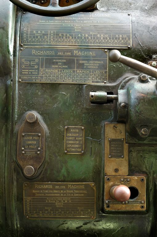 Vue de la halle d'usinage : détail des plaques de l'aléseuse Malf Richard (1948)Immatriculation