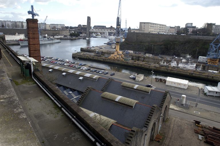 Vue générale ouest donnant sur les halles abritant le marteau pilon et la Penfeld. On aperçoit une des deux formes de Pontaniou. En arrière-plan : le pont de Recouvrance et le châteauImmatriculation