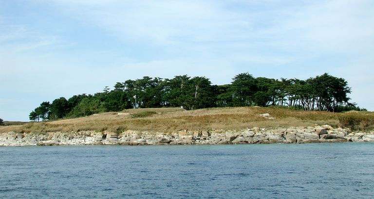 Vue de Penn ar C'hleguer depuis la mer : la batterie de côte se confond avec le terrain environnantImmatriculation