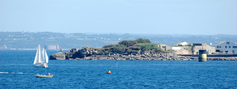 Vue du Château du Taureau à Plouezoch et du Fort Bloscon à Roscoff depuis Penn ar C'hleguer. Les batteries de côte et forts correspondaient avec des mâts de pavillonImmatriculation
