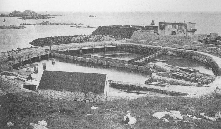 Vue de la pointe de Bloscon avec les viviers Sainte-Barbe, carte postale, fin 19e siècle - début 20e siècle. Dans l'enceinte du fort, grande maison de notableImmatriculation