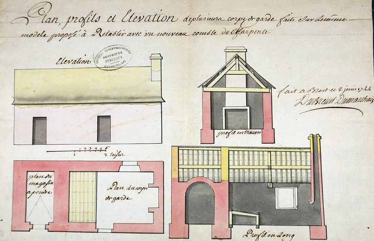 L'oeuvre graphique des ingénieurs militaires au service de la connaissance du patrimoine fortifié : plan d'un corps de garde à rétablir avec un nouveau comble de charpente par Dubreuil Dumarchais 1744Immatriculation