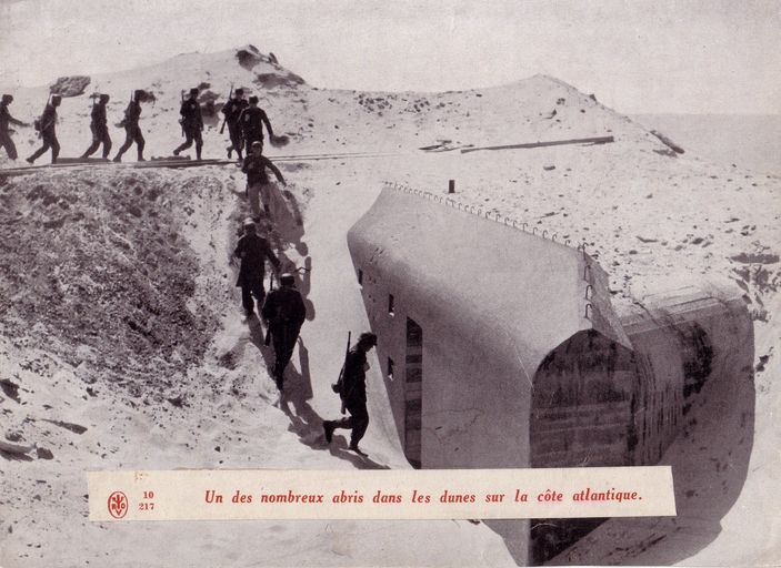 Image de propagande nazie : "Un des nombreux abris dans les dunes sur la côte Atlantique" [bunker non localisé au milieu des dunes : une patrouille allemande rentre dans un abri à personnel]Immatriculation