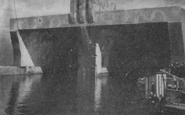 Extrait de l'ouvrage de propagande nazie intitulé "Laissez les tranquillement venir" : quatrième double page [troisième photographie montrant la base de sous-marins du Scorff à Lanester, 1941]. La peinture camouflage de la base est particulièrement visibleImmatriculation