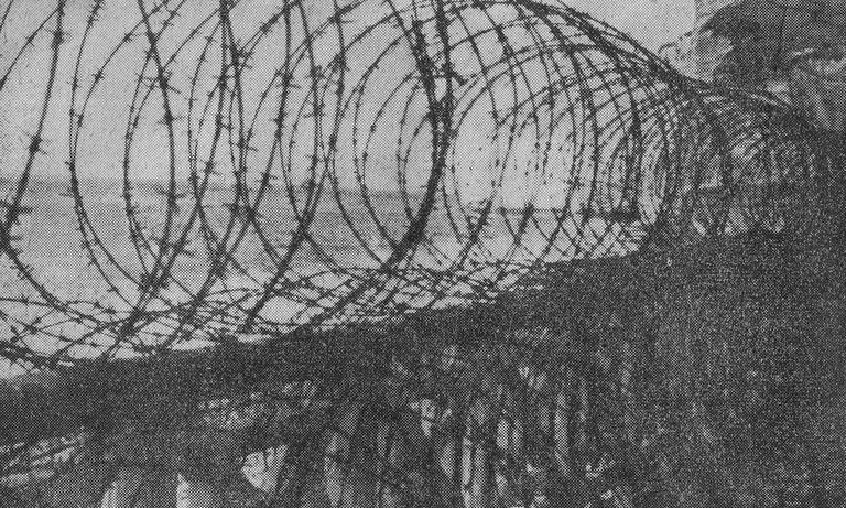 Ouvrage de propagande nazie intitulé "Laissez les tranquillement venir" utilisant le Mur de l'Atlantique : légende, "Des barrages très étendus en fil de fer barbelé sillonnent la zone côtière"Immatriculation
