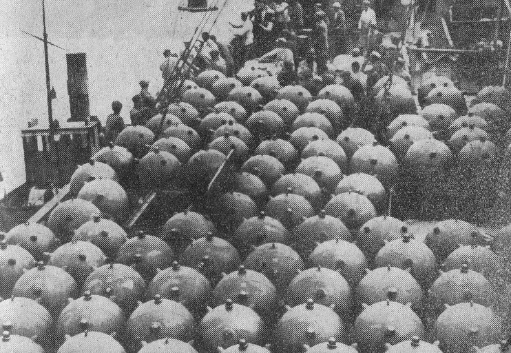 Ouvrage de propagande nazie intitulé "Laissez les tranquillement venir" utilisant le Mur de l'Atlantique : légende, "D'innombrables barrages de mines sont posés dans les eaux côtières"Immatriculation