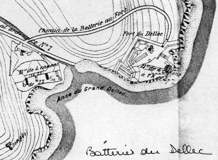 Extrait du plan de situation des batteries de Dellec (batterie du fort : 4 canons à tir rapide de 47 mm, batterie extérieure de 4 canons de 32 cm), Atlas des batteries de côte : côte de Brest, 1893, VincennesImmatriculation