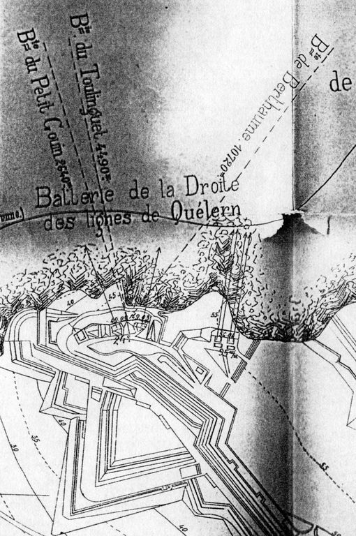 Détail du plan de situation des lignes et du réduit de Quélern : batterie de la Droite des lignes, Atlas des batteries de côte : côte de Brest, 1893, VincennesImmatriculation