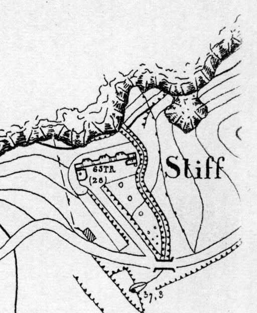 Détail du plan de situation des batteries de Robert et du Stiff : batterie du Stiff (canons de 65 mm à tir rapide), Atlas des batteries de côte : côte de Brest, 1913, VincennesImmatriculation