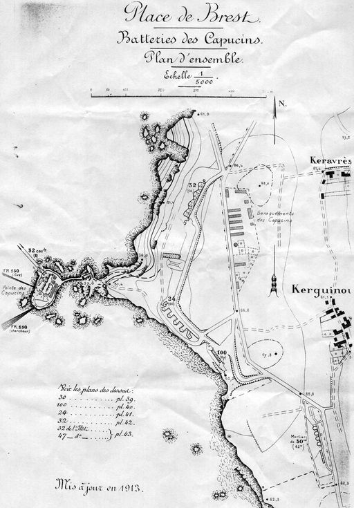 Plan de situation de la batterie des Capucins : 4 canons M de 24 cm modèle 1870 sur affûts M modèle 1883 PC, Atlas des batteries de côte : côte de Brest, 1913, VincennesImmatriculation