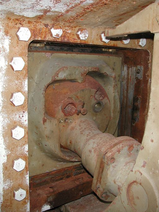 Vue du canon antichar Skoda de 4,7 cm : détail de la rotule (état en 2004)Immatriculation