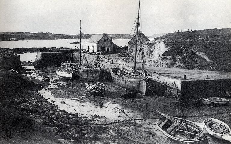 Vue ancienne du port de Lampaul : le bateau courrier à vapeur est mouillé au milieu du plan d'eauImmatriculation