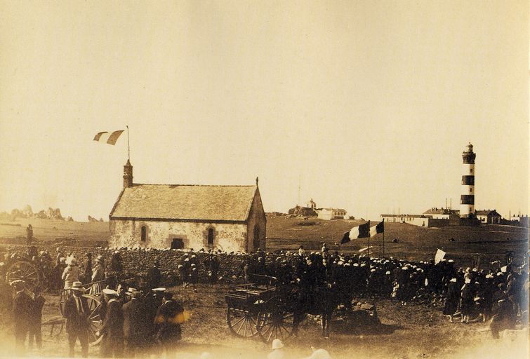 Pardon à la chapelle Saint-Gildas (puis Notre-Dame de Bon Voyage) en 1925. En arrière-plan : le phare du Créac'h et le bâtiment abritant la corne de brume à air comprimé (1867)Immatriculation