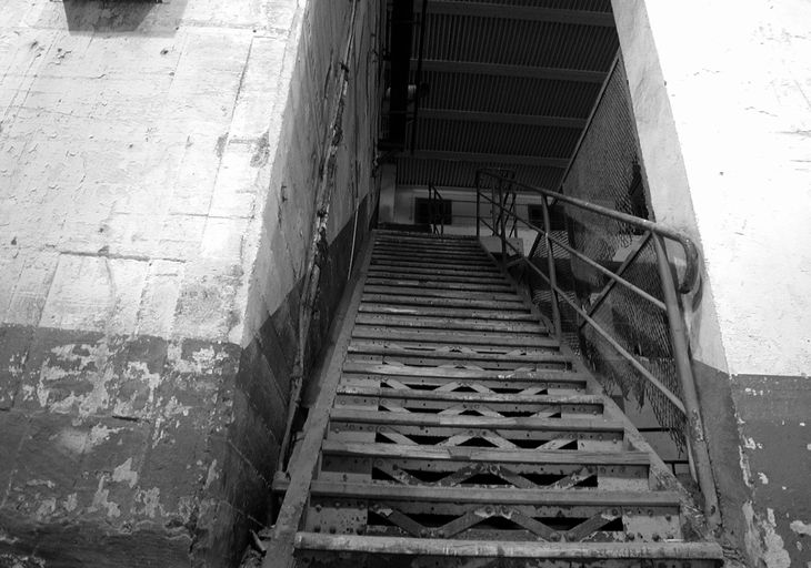 Vue intérieure de la base de sous-marins : escalier préfabriqué en acier d'origine allemande (2004)Immatriculation