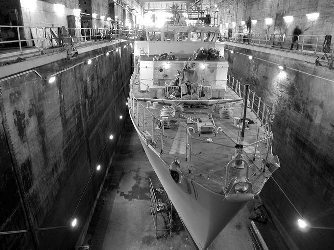 Vue intérieure de la base de sous-marins : navire en maintenance dans une alvéole à sec (2004)Immatriculation