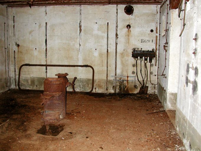 Vue du bunker de type 502 de la ligne de défense terrestre ouest de Brest (Kervaoter, B n° 69 / 1) : chambre de troupe avec poêle et boitier de connexion téléphoniqueImmatriculation