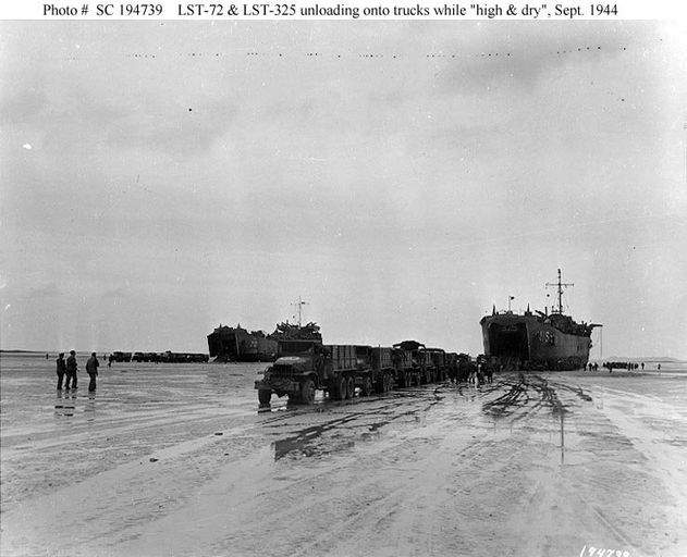 Débarquement de matériel lourd pour le siège de Brest depuis deux Lst (à droite : Lst n° 325 et à gauche Lst n° 72) sur la plage de Plestin-les-Grèves à marée basse, première quinzaine de septembre 1944 (US Naval Historical Center)Immatriculation