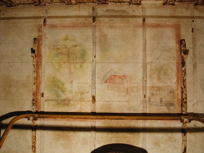 Vue de la peinture murale n° 2 : paysage de campagne (arbres, maison couverte en tuile)Immatriculation