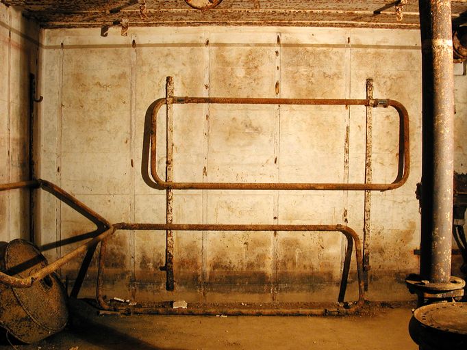 Vue de la chambre de troupe droite : lits - couchettes superposées, tuyau du poêle (premier plan), filtre de ventilateur à charbon (sur le sol, à gauche)Immatriculation
