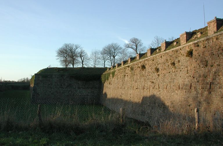Elévation Sud : détail de la courtine. Noter les souches de cheminée de la caserne aménagée dans l'épaisseur du rempartImmatriculation