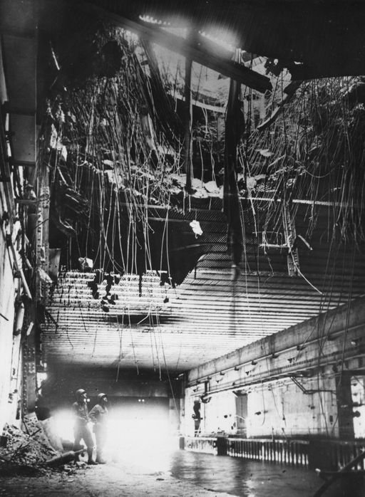 Vue intérieure de la base de sous-marins : cratère de bombe Tallboy dans l'alvéole n° 2Immatriculation