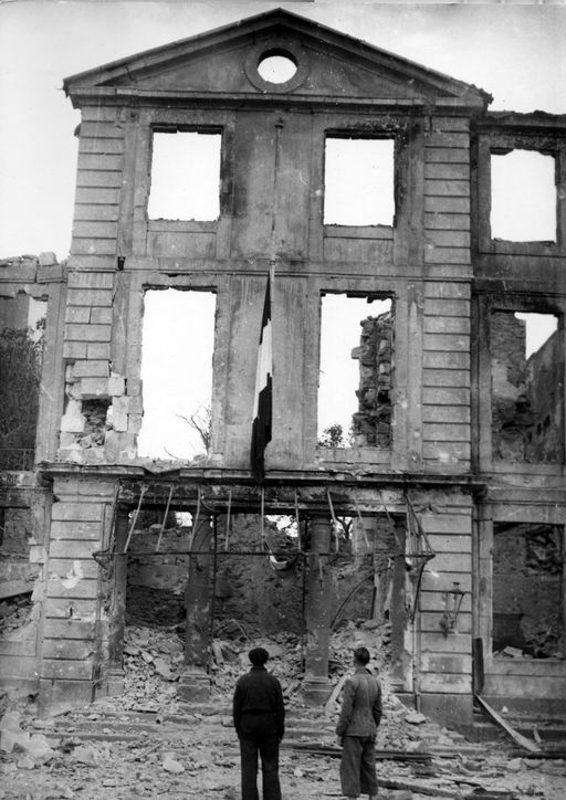 Vue des vestiges de la façade de la préfecture maritime de Brest située rue de Siam, septembre 1944Immatriculation