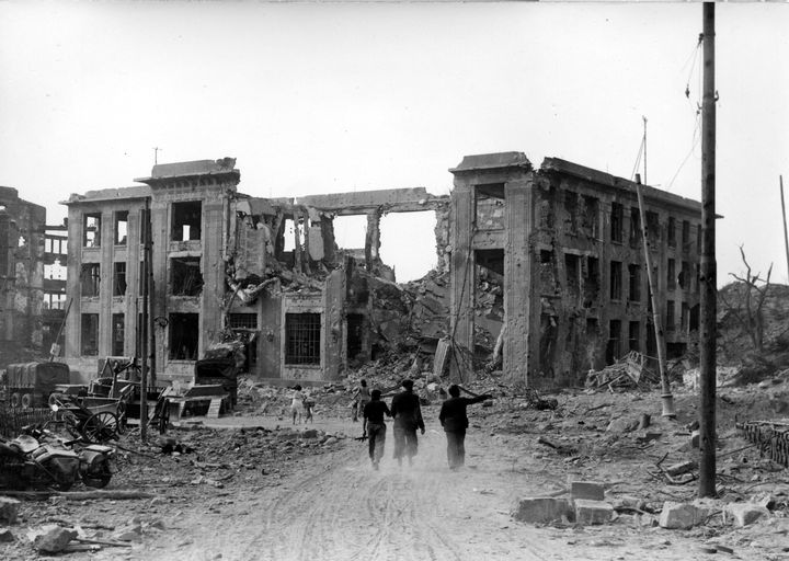 Vue du bâtiment de la poste situé en haut de la rue de Siam, septembre 1944Immatriculation