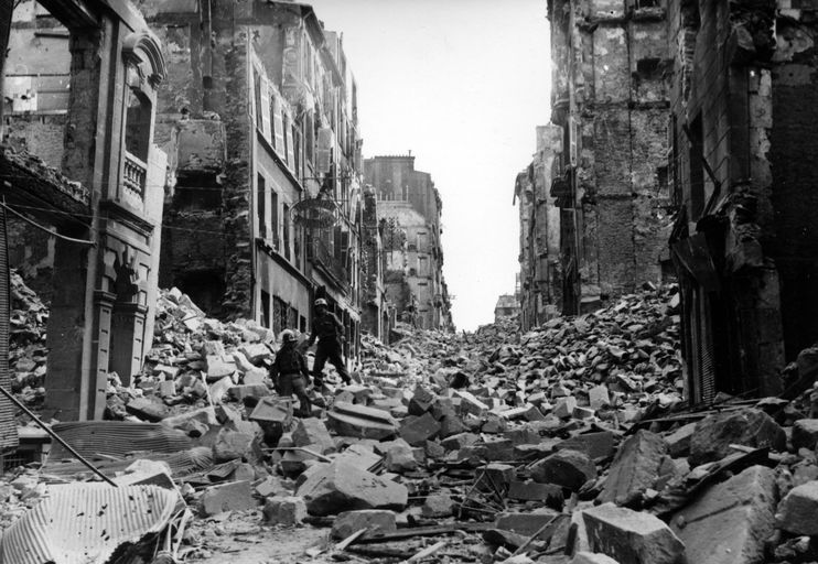 Vue de la rue Jean Macé. Deux infirmiers américains inspectent les ruines à la recherche de victimes, septembre 1944Immatriculation