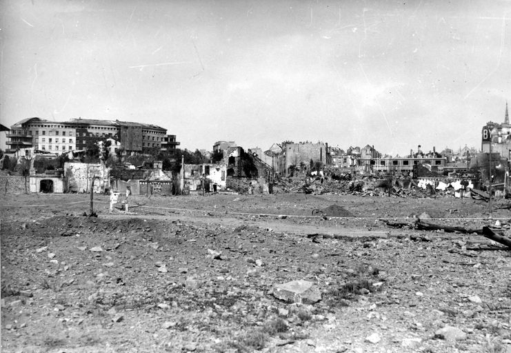 Vue du panorama de la Place de la Liberté vers l'hôpital Morvan, fin 1944. Les immeubles éventrés témoignent de la violence des bombardementsImmatriculation