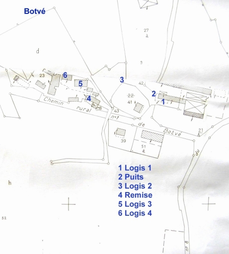 Plan-masse et emplacement des éléments repérés sur fond du cadastre de 1981.Immatriculation