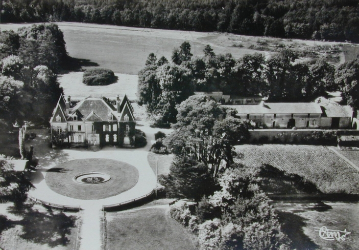Vue aérienne du domaine depuis le sud, avec le château, à gauche, et la ferme, à droite. Carte postale, vers 1960Immatriculation