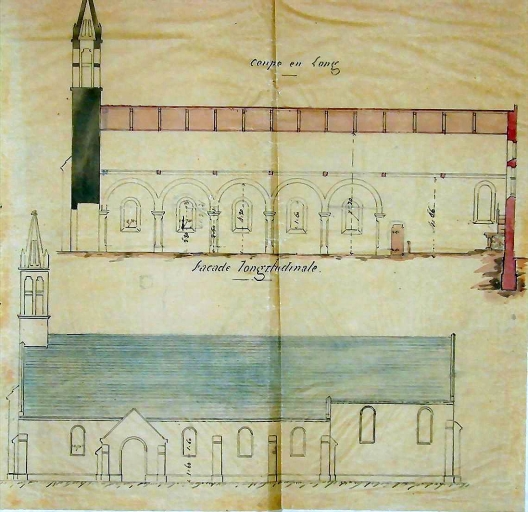 Locunolé, église paroissiale Saint-Guénolé : projet (coupe longitudinale et élévation sud) réalisé, par Joseph Bigot, 1863 (A. E. Quimper, 8 L fonds Bigot), reproduction de 2004Immatriculation