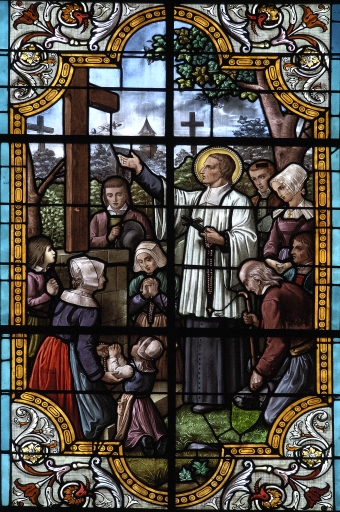 Ensemble des 6 verrières à personnages des baies 1, 2, 5 à 8 : Bienheureux Louis-Marie Grignion de Montfort, Éducation de la Vierge, Annonciation, Présentation du Christ au temple, Don des clés, et des verrières décoratives des baies 2 et 3,