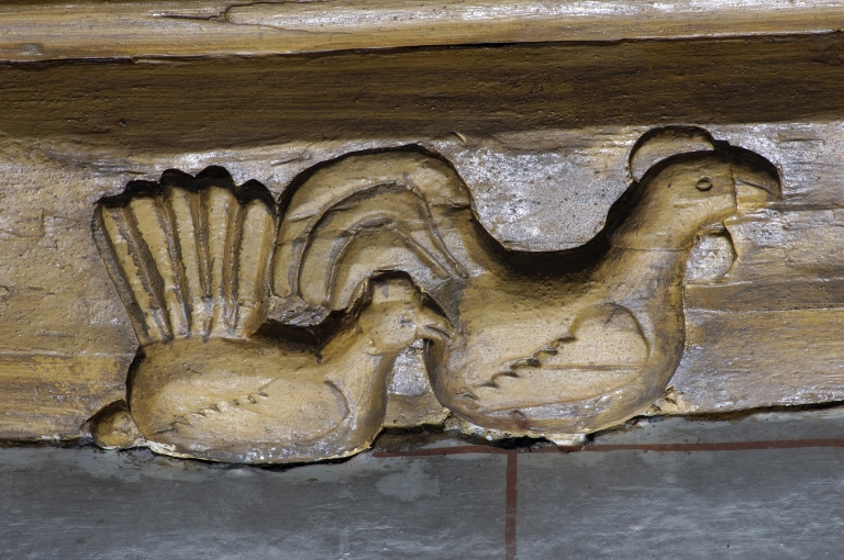Mur sud, 3e sablière : coq et pouleImmatriculation