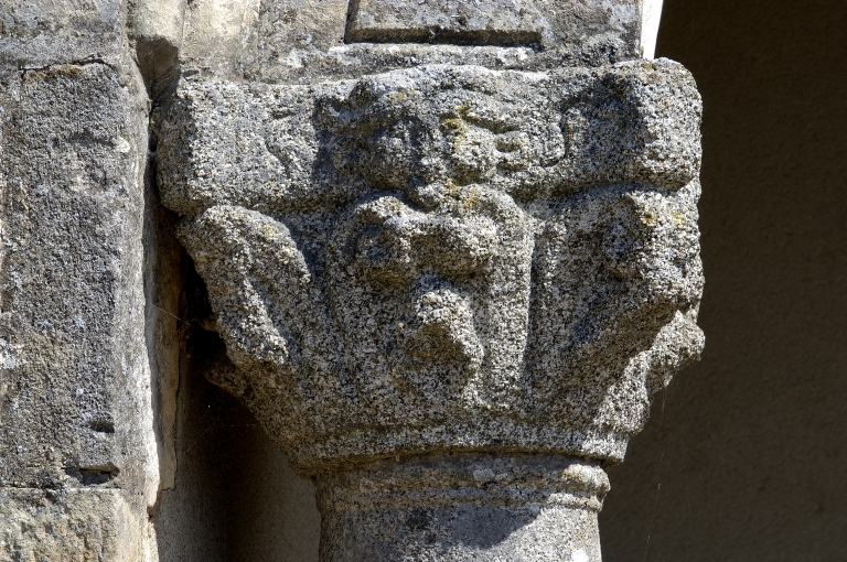 Détail du chapiteau sculpté du porche portant la date de 1552 ou 1559 (colonne de gauche)Immatriculation