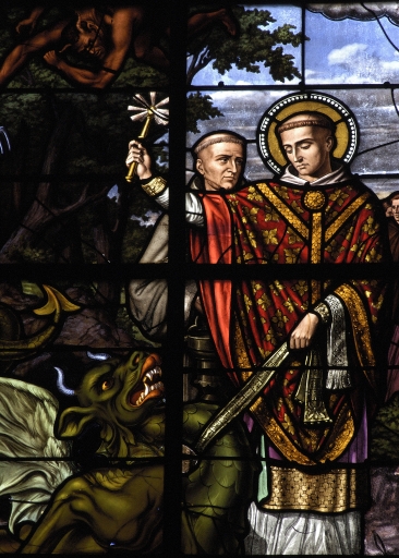 Verrière de la baie 00 : Comment saint Armel traîne et noie le dragon dans la Seiche. (515), vue rapprochéeImmatriculation