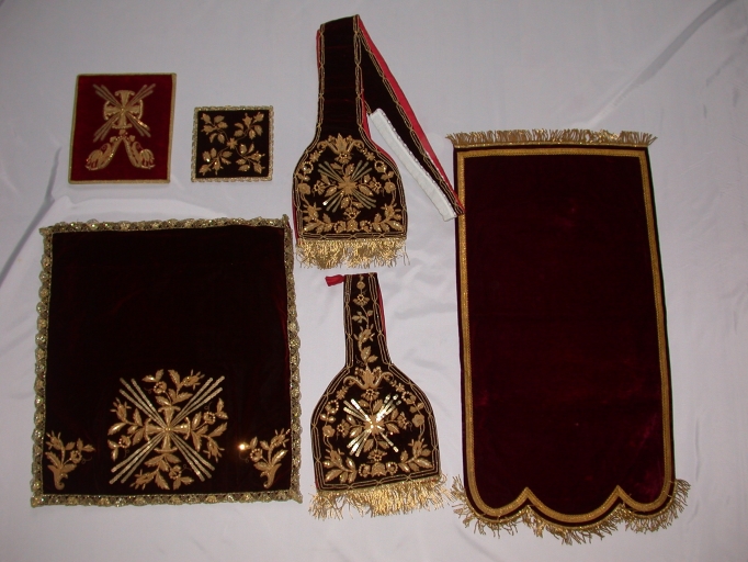 Ornement rouge : chasuble, bourse de corporal, étole, manipule, voile de calice, pale et voile de pupitre d'autel,