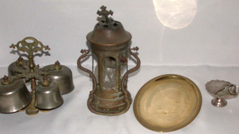 Sonnette liturgique, lanterne du viatique, plateau de communion et coquille de baptêmeImmatriculation