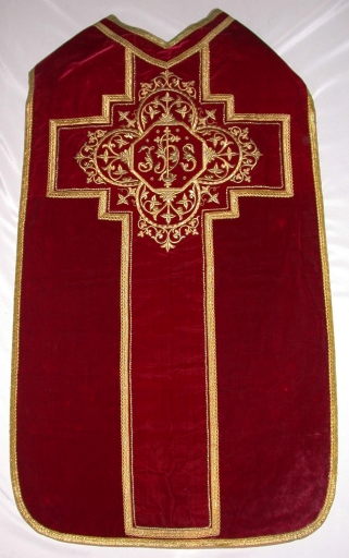 Ornement rouge 3 : chasuble, bourse de corporal, étole, manipule, voile de calice,