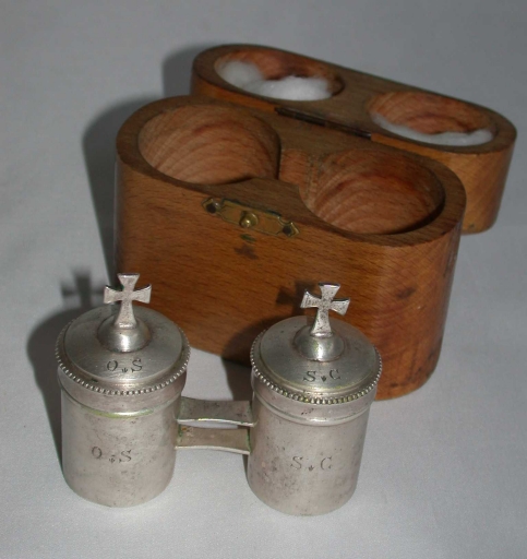 Ampoule à saint-chrême et ampoule à huile des malades dans leur coffretImmatriculation