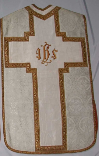 Ornement blanc 3 : chasuble, bourse de corporal, étole, manipule, voile de calice,