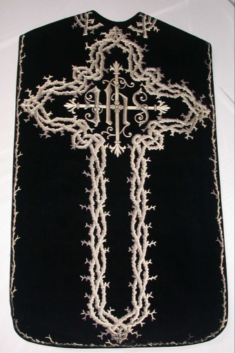Ornement noir 1 : chasuble, bourse de corporal, étole, manipule, voile de calice,