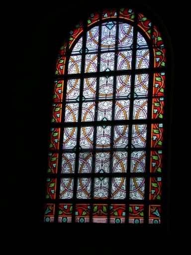 Ensemble des verrières à personnages des baies 1, 2, 4 : Saint Charles Boromée, Saint Thomas, Saint Pierre, Saint Jean, Notre-Dame de Lourdes, et des verrières décoratives des baies 3 et 5,